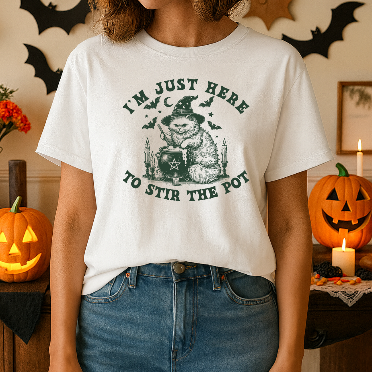 Sassy, spooky, and a little bit magical — this tee is for the mischief-makers and cat lovers alike! Featuring a playful black cat rocking a witch hat and the cheeky phrase "I'm Just Here to Stir the Pot," it’s the perfect blend of Halloween humor and feline attitude.