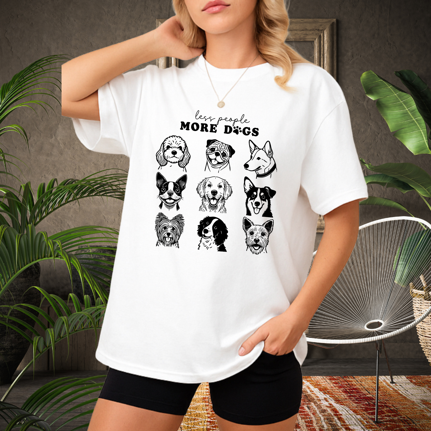 Tired of small talk  and big crowds? Let the world know where your heart truly lies. Our " Less people, More dogs" T-shirt says it loud and proud, featuring playful doodles of pups in all shapes and sizes. Whether you are a proud dog parent or just dog obsessed, this shirt brings cozy vibes and canine charm to your everyday look.